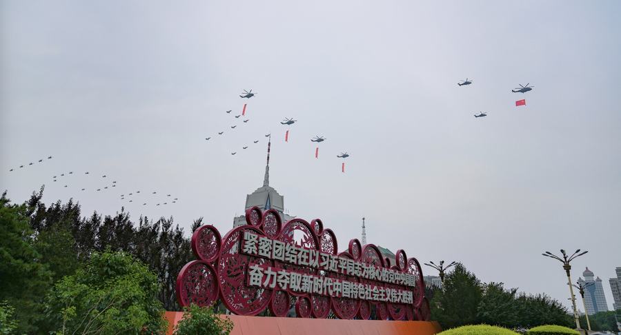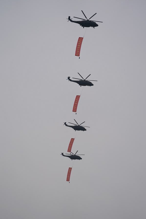 此次参演的空中梯队依次是空中护旗梯队、空中“数字”梯队、歼击机梯队和教练机梯队。其中,空中护旗梯队护卫党旗并挂装“伟大的中国共产党万岁”“伟大的中国人民万岁”“伟大的中华人民共和国万岁”“全国各族人民大团结万岁”庆祝标语,率先通过天安门广场,拉开飞行庆祝表演序幕。参演直升机所悬挂的标语字幅面积大、空中姿态稳定难,4机同步要求高,航空工业通过前期大量科研鉴定试飞工作,提前攻克难关,令参演装备能够以良好的操稳特性和飞行状态,带领空中梯队“米秒不差”飞越天安门广场。
